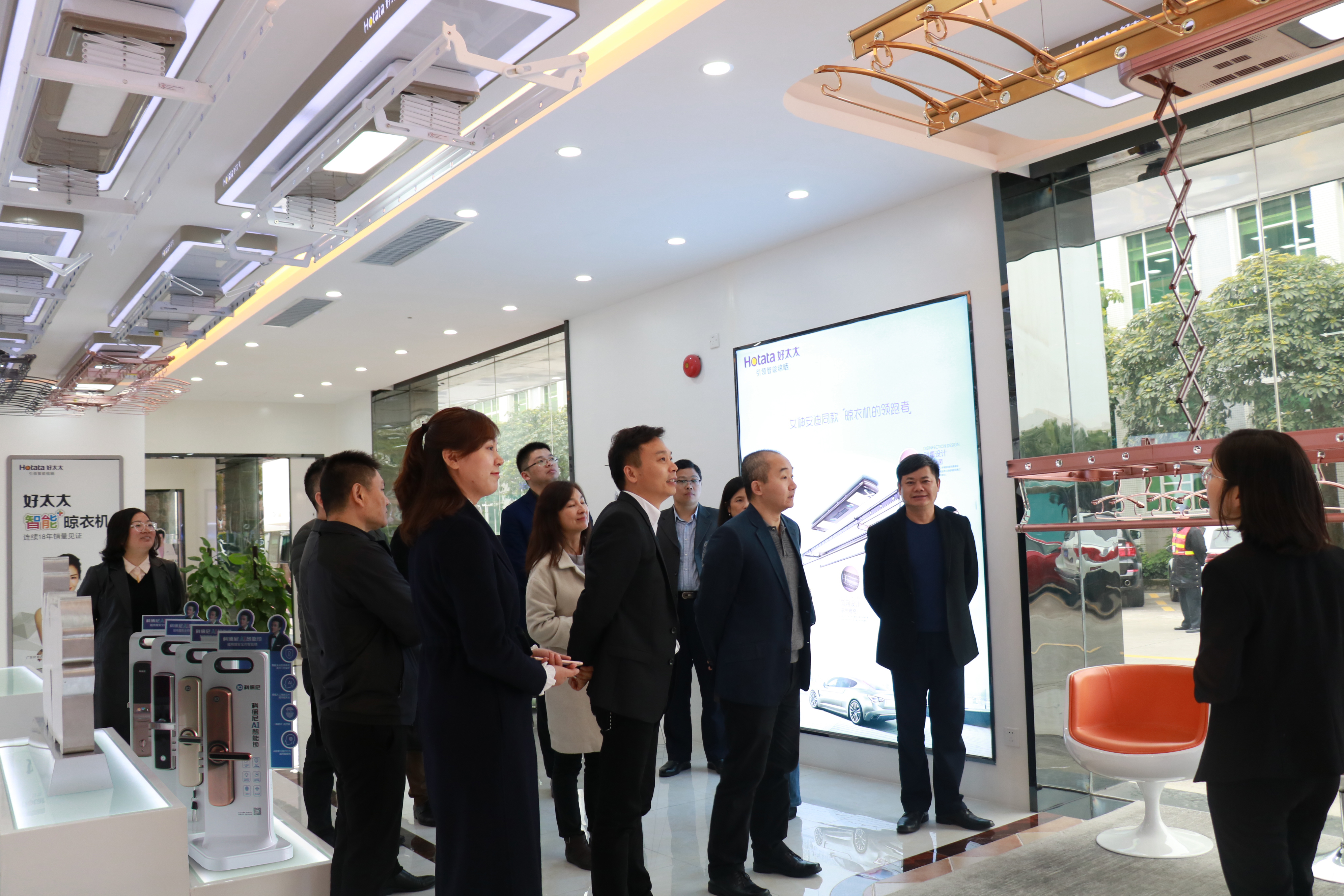 會議結束后,調研組參觀了廣東好太太集團品牌展示中心,參觀過程中,由廣東好太太集團董事長沈漢標圍繞公司的核心技術產品作現場介紹講解。隨著物聯網、云計算產業(yè)的蓬勃發(fā)展,以智能鎖、智能晾衣機為代表品類的智能家居已成為物聯網領域備受矚目的應用。廣東好太太集團正著力打造智慧家庭生態(tài)圈,以智能鎖、智能晾衣機為拳頭產品,打造智能安防、智能晾曬、智能清潔、智能交互四大板塊,實現家居生活場景全覆蓋。