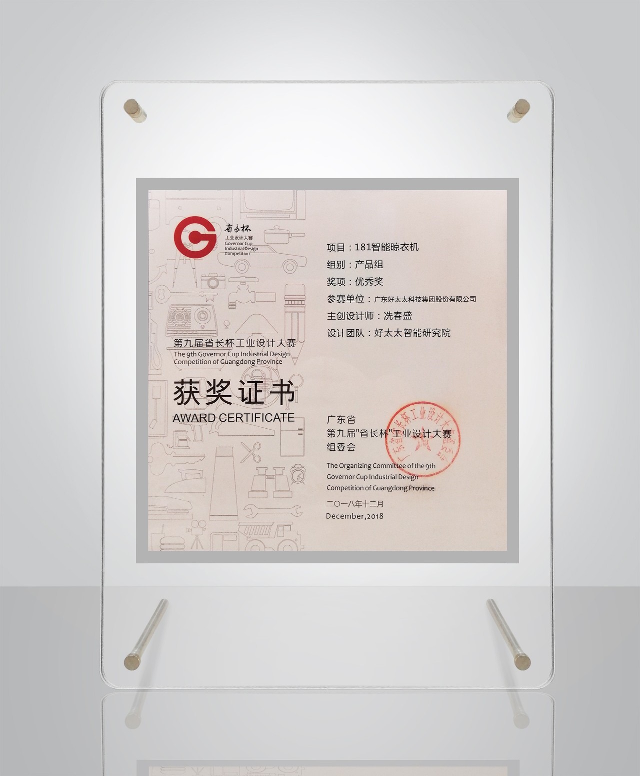 由廣東省人民政府工業和信息化廳主辦,廣東省工業設計協會承辦的第九屆“省長杯”工業設計大賽經過約4個月的賽程已經結束。本屆“省長杯”在全省21個地市,15個分賽區充分發動,從破紀錄的32051件參賽作品中,選出513件決賽作品,并最終決出30件獲獎作品和30個單項獎。其中,好太太智尊系列GW-181憑借創新的產品工業設計脫穎而出,榮獲“省長杯”工業設計大賽獎。
