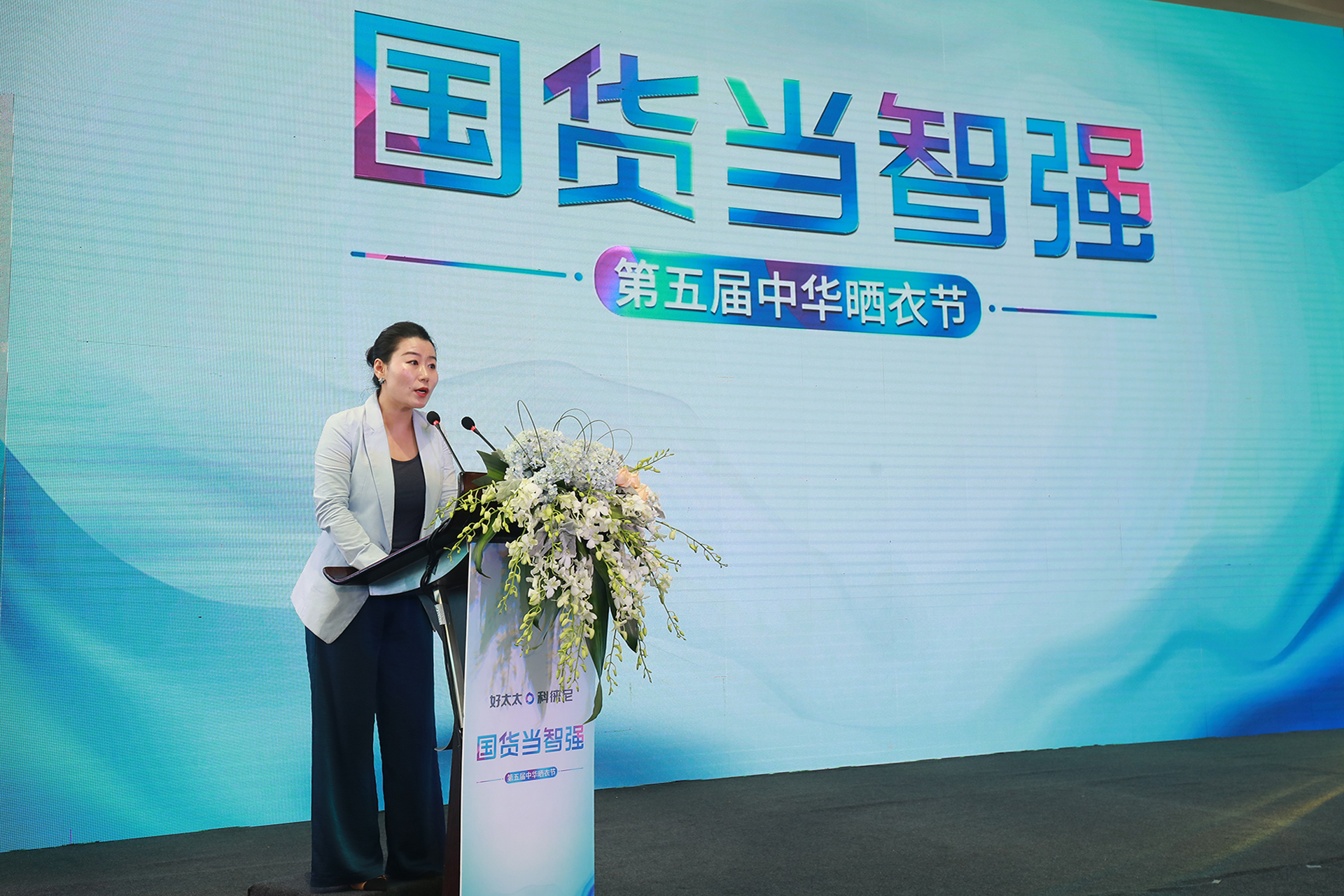 廣東好太太集團總裁王妙玉女士也登臺為第五屆中華曬衣節致辭。表明了好太太集團倡導文化自信,以智能家、趣生活為核心使命以強大的科技賦能創新晾曬新革命,為人們提供了輕松、快樂的生活方式。