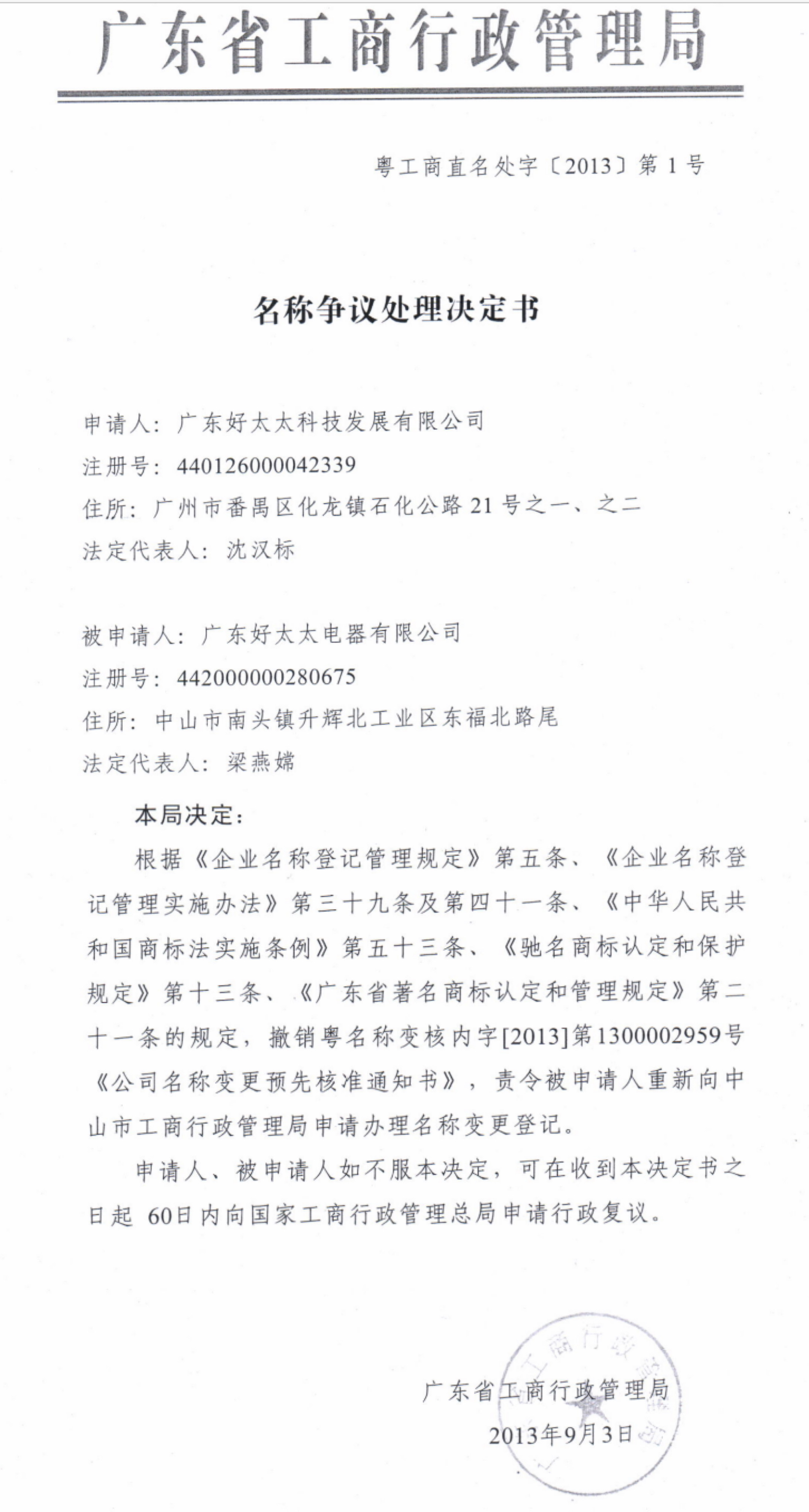 2009年11月20日,時稱中山市好太太電器有限公司的法定代表人老健明設(shè)立了中山市好生活電器有限公司,后于2013年1月30日更名為“中山市好太太電器有限公司”、于2013年2月27日更名為“廣東好太太電器有限公司”。因該企業(yè)名稱中再次使用“好太太”字號涉嫌不正當(dāng)競爭,被廣東好太太集團(tuán)向廣東省工商行政管理局投訴,于2013年9月3日被廣東省工商局責(zé)令變更企業(yè)名稱。
