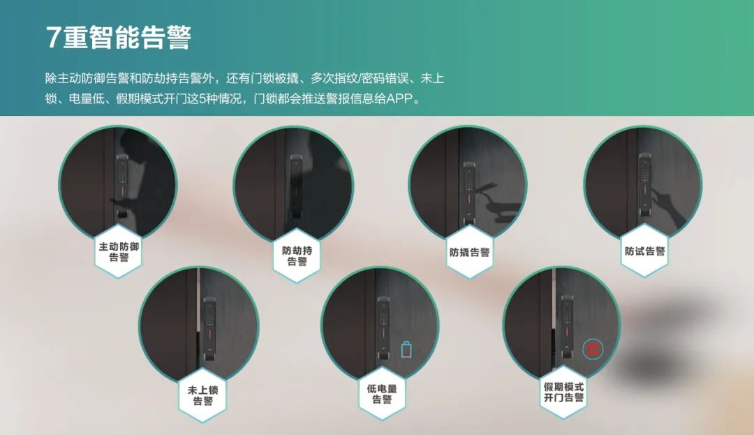 7重智能告警,給你貼心守護(hù),防撬、防試、防劫持三重防護(hù),未關(guān)門(mén)、低電量雙重提醒,主動(dòng)防御、假期模式兩種智能使用場(chǎng)景